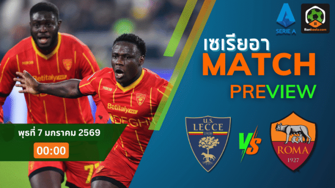 ศึกใหญ่บนเวที เซเรียอา คืนวันพุธที่ 7 มกราคม 2569 เวลา 00.00 น. ตามเวลาไทย แฟนบอลอิตาลีต้องห้ามพลาด เมื่อเจ้าถิ่น เลชเช่ ทีมโซนครึ่งล่างของตาราง เปิดสังเวียนเวีย เดล มาเร่ รับการมาเยือนของ “หมาป่ากรุงโรม” โรม่า ทีมอันดับ 5 ที่กำลังไล่ล่าพื้นที่ยุโรปแบบหายใจรดต้นคอคู่แข่งเหนือหัว เกมนี้บรรยากาศคาดว่าจะเดือดตั้งแต่นกหวีดแรก เพราะต่างฝ่ายต่างมีเป้าหมายชัดเจน เจ้าบ้านต้องการทุกแต้มเพื่อหนีโซนแดง ส่วนทีมเยือนต้องการสามคะแนนเพื่อกดดันคู่แข่งโดยตรงในลุ้นโควตาถ้วยยุโรป