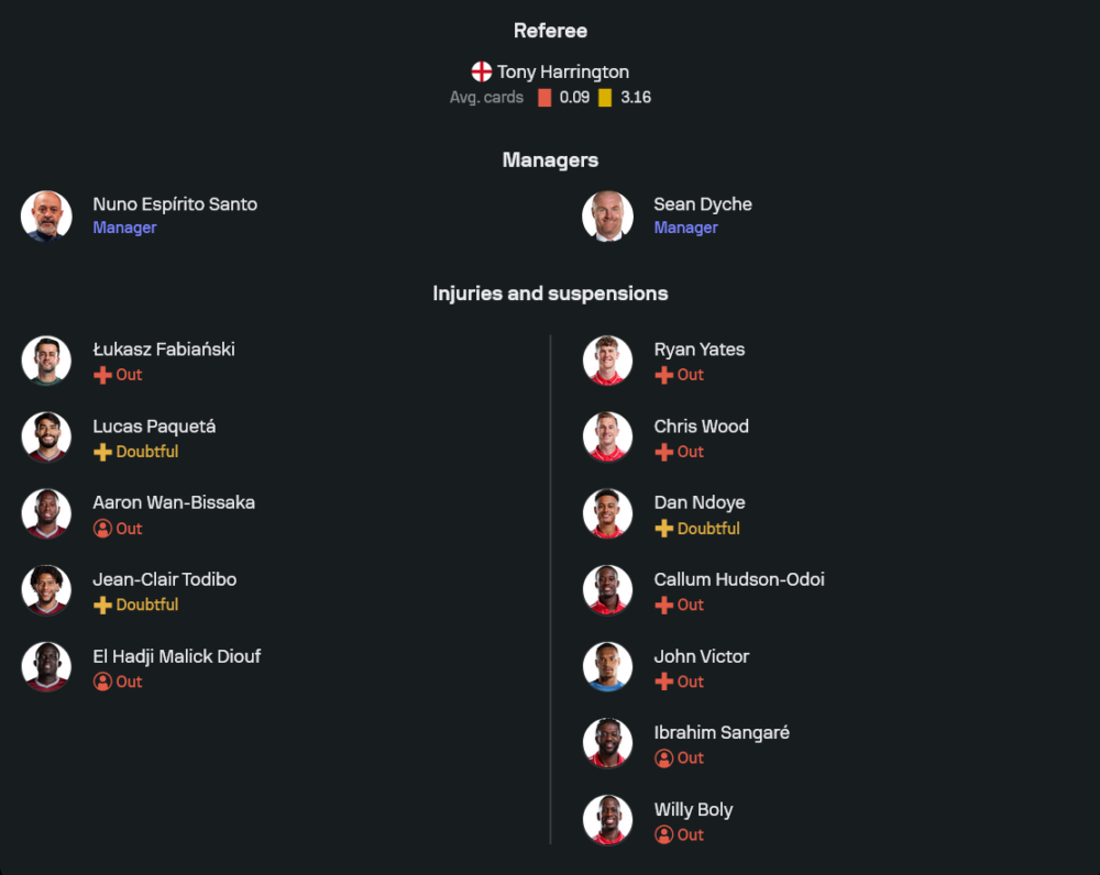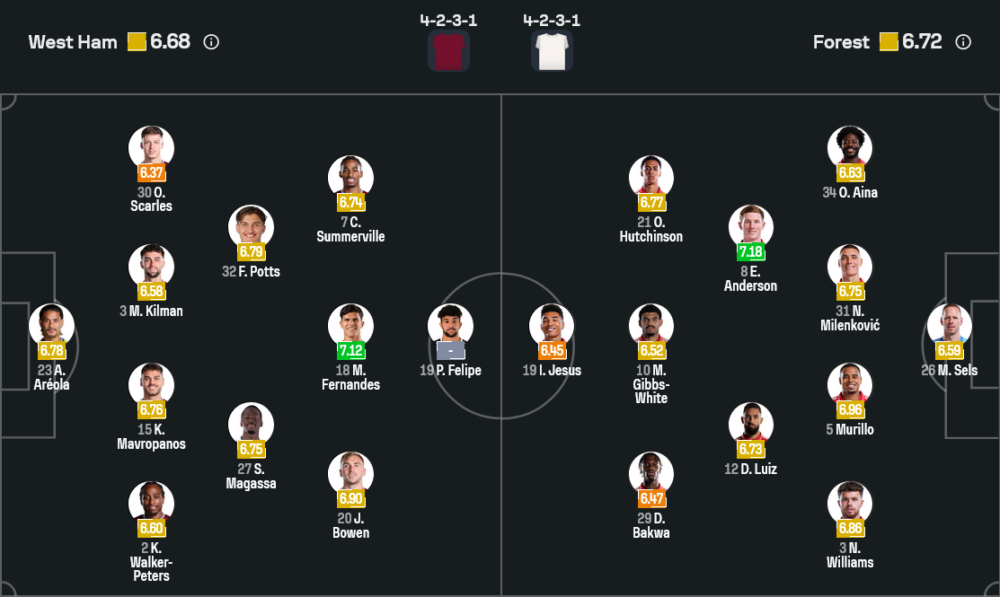 ภาพจากข้อมูลไลน์อัปของ Sofascore ชี้ให้เห็นว่า ทั้งเวสต์แฮมและฟอเรสต์ต่างจัดทัพระบบ 4-2-3-1 ลงสู้กันแบบไม่มีกั๊ก ฝั่งขุนค้อนใช้ อัลฟอนซ์ อาเรโอล่า เฝ้าเสา แผงหลังนำโดย คอนสแตนตินอส มาฟโรปานอส กับ แม็กซิมิเลียน คิลแมน ด้านเกมรุกฝากความหวังไว้ที่ จาร์ร็อด โบเว่น, ครีเซนซิโอ ซัมเมอร์วิลล์ และ ปาโบล เฟลิเป้ ส่วนฟอเรสต์มี มัตซ์ เซลส์ เป็นด่านสุดท้าย แนวรับใช้ นิโคล่า มิเลนโควิช จับคู่ มูริลโล่ ขณะที่ตัวทำเกมคือ มอร์แกน กิ๊บบ์ส ไวท์ สนับสนุน อิกอร์ เฮซุส ในแดนหน้า เป็นการปะทะกันของระบบและสไตล์ที่คล้ายกันแต่รายละเอียดต่างกันชัดเจน