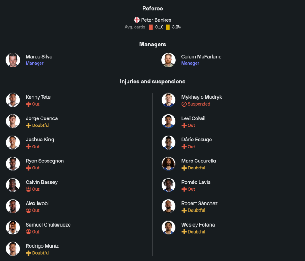 อย่างไรก็ดี ผู้เล่นหลายรายของสิงห์บลูส์ยังไม่พร้อมลงสนาม ทั้งไมคายโล มูดริค ที่โดนแบน รวมถึง เลวี โคลวิลล์, ดาริโอ เอสซูโก และโรเมโอ ลาเวีย ที่เจ็บ ส่วนมาร์ค คูคูเรยา, โรเบิร์ต ซานเชซ และเวสลีย์ โฟฟานา ยังต้องรอเช็กความฟิต ทำให้แม็คฟาร์เลนต้องบริหารขุมกำลังอย่างรอบคอบ