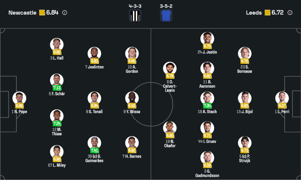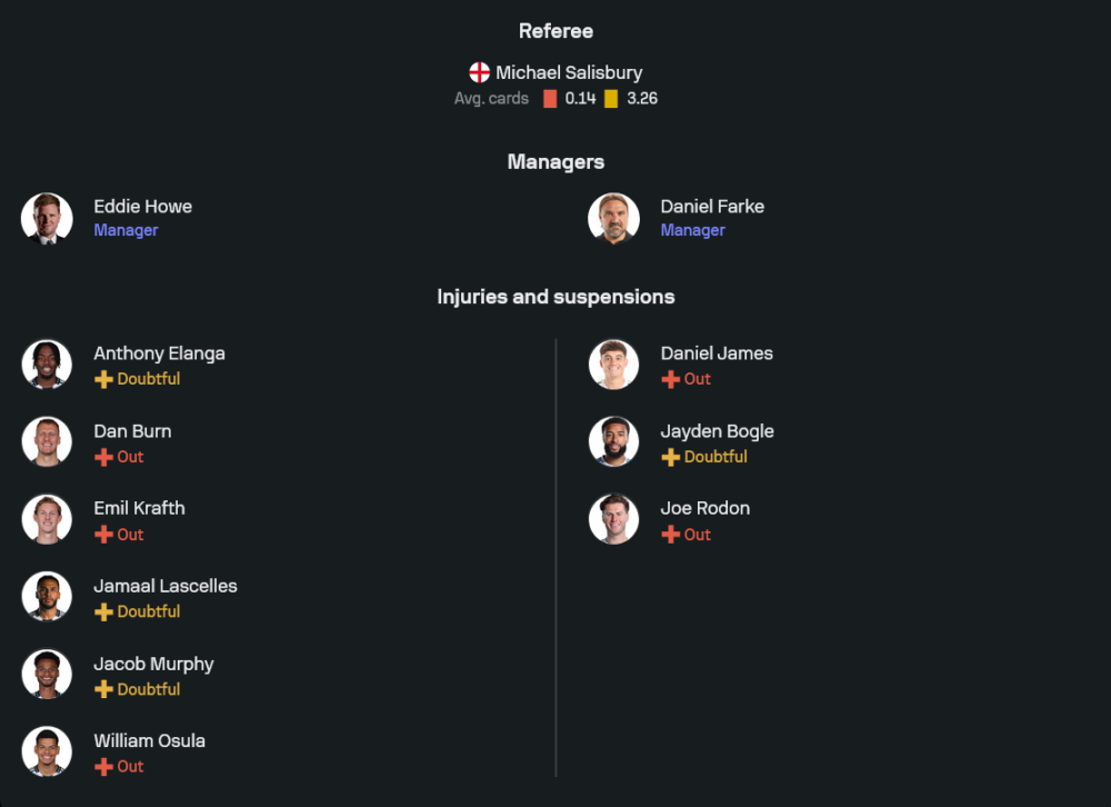 อย่างไรก็ตาม จากภาพจัดตัวที่เผยแพร่ล่าสุดคาดว่า ฮาวจะวางหมากในระบบ 4 3 3 ในนัดนี้ นิค โป๊ป เฝ้าเสา แนวรับนำโดยฟาเบียน แชร์ จับคู่กับมาลิค ทิอาว โดยมีลูอิส ฮอลล์ กับ ลูอิส ไมลีย์ รับบทฟูลแบ็ก แดนกลางให้บรูโน กิมาไรส์ สวมปลอกแขนกัปตันคุมด้านลึก ร่วมกับซานโดร โตนาลี และโชเอลินตัน คอยเชื่อมเกมสามแดนหน้า ส่วนแนวรุกมีแฮร์วีย์ บาร์นส์, แอนโธนี กอร์ดอน และโยอัน วิสซา เป็นสามหอกตัวจบสกอร์ หากเมอร์ฟีฟิตทันก็อาจเบียดหนึ่งในแนวรุกหลุดไปนั่งข้างสนาม