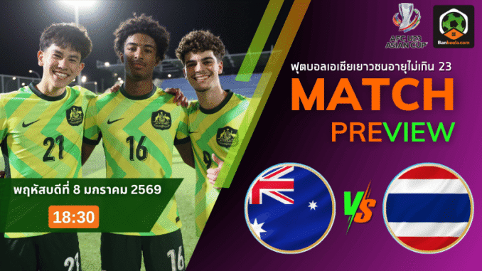 ศึกฟุตบอล ยู-23 ชิงแชมป์เอเชีย ค่ำคืนวันพฤหัสบดีที่ 8 มกราคม 2569 เวลา 18.30 น. แฟนบอลชาวไทยเตรียมระเบิดอารมณ์กันให้สุด เมื่อขุนพล “จิงโจ้จูเนียร์” ออสเตรเลีย ยู-23 ลงสนามฟัดกับ “ช้างศึกสายเลือดใหม่” ทีมชาติไทย ยู-23 เกมนี้ถือเป็นอีกหนึ่งคู่ที่ถูกจับตามองในหน้า ตารางบอลวันนี้ เพราะมีทั้งเรื่องศักดิ์ศรีในทวีป และเดิมพันเรื่องทิศทางเข้ารอบของทั้งสองทีมแบบเต็มๆ