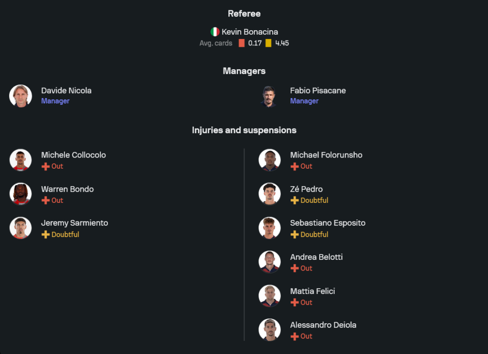 ดาวิเด นิโคลา กุนซือเจ้าถิ่นยังเดินหน้าด้วยโครงสร้าง 3-5-2 อันเป็นลายเซ็นในซีซันนี้ แผงหลังสามคนใช้ ฟรานเชสโก บาสคีร็อตโต้ ยืนคุมแนวรับร่วมกับ จานลูกา เปซเซลลา และ มัตเตโอ เบียงเก็ตติ โดยมี เอมีล ออเดโร่ เฝ้าเสา