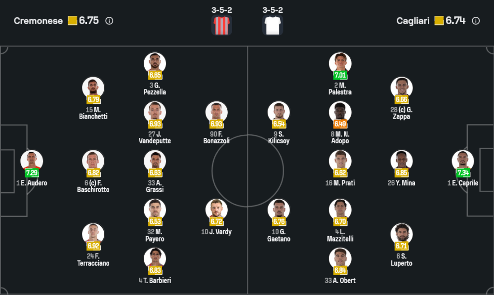 ฝั่งกายารี่ของกุนซือไฟแรง ฟาบิโอ พิซาคาเน ลงสนามด้วยระบบ 3-5-2 เช่นกัน ผู้รักษาประตูใช้ เอลิอัส คาปริเล ยืนเป็นด่านสุดท้าย ข้างหน้ามี เยอร์รี มีน่า, ซิโมเน ลูแปร์โต และ อดัม โอเบิร์ต เป็นสามเซ็นเตอร์แบ็ก