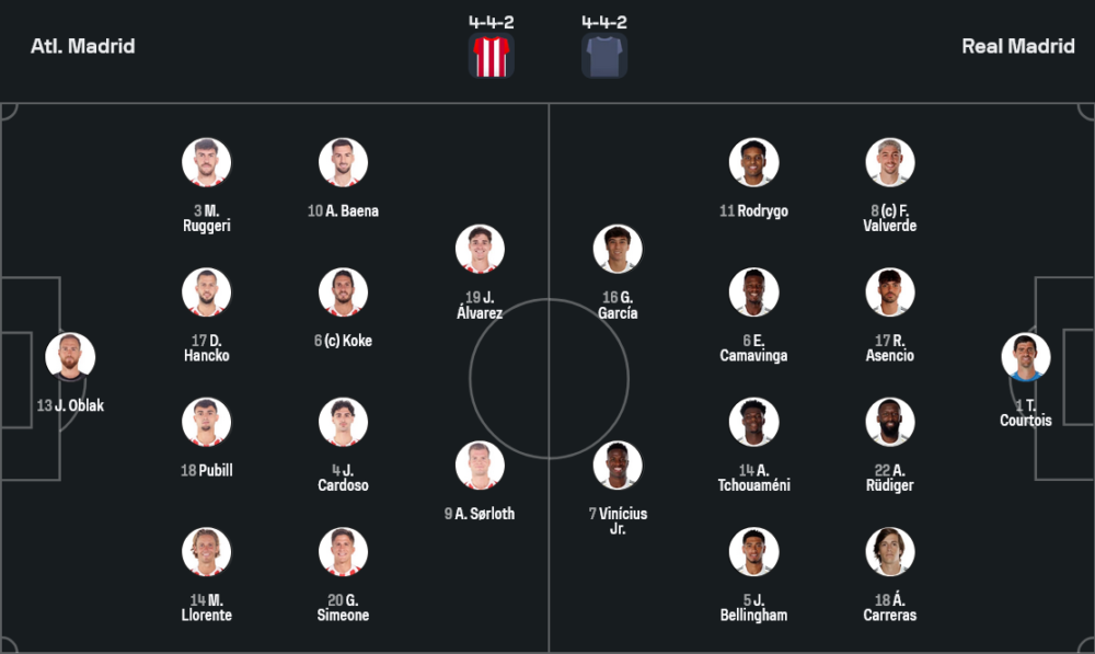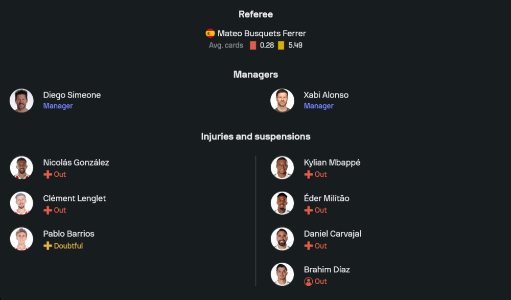 ฝั่งราชันชุดขาวของ ชาบี อลอนโซ่ เจอข่าวร้ายหลายระลอก แนวรับยังไม่มี เอแดร์ มิลิเตา ที่เดี้ยงยาว รวมถึง ดาเนียล การ์บาฆาล ขณะที่แนวรุกต้องอดใช้บริการ คิเลียน เอ็มบัปเป้ และ บราฮิม ดิอาซ ที่ยังอยู่ในลิสต์เจ็บเช่นกัน อย่างไรก็ตาม ขุมกำลังที่เหลือยังโหดพอสร้างฝันร้ายให้คู่แข่งในระบบ 4-4-2 ติโบต์ กูร์กตัวส์ ยืนด่านสุดท้าย แผงหลังประกอบด้วย ฟราน การ์ราสโก้ หรือ อัลบาโร่ การ์เรราส ทำเกมริมเส้นร่วมกับ อันโตนิโอ รูดิเกอร์ และเพื่อนคู่หูเซ็นเตอร์อีกหนึ่งราย แดนกลางวางคู่ห้องเครื่อง ออเรเลียง ชูอาเมนี่ จับคู่ เอดูอาร์โด้ กามาวินก้า ข้างหน้าเป็นสามตัวปั้นเกม โรดรีโก้, จู๊ด เบลลิงแฮม และ วินิซิอุส จูเนียร์ ทำเกมสนับสนุนหน้าเป้า กอนซาโล่ การ์เซีย ที่พร้อมสอดขึ้นไปจบสกอร์ทุกจังหวะ