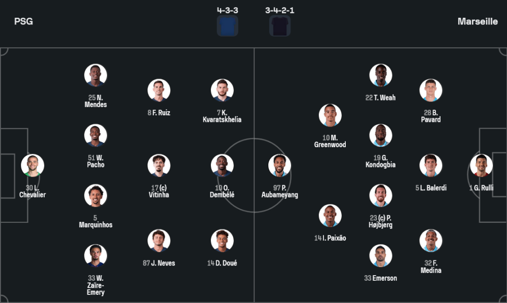 เปแอสเชภายใต้หมาก 4-3-3 ของลุยส์ เอ็นรีเก้ ยังจัดทัพได้แน่นระดับตัวจริงเปลี่ยนชื่อแต่ความโหดเท่าเดิม แดนหลังมี ลูคัส เชอวาลิเยร์ ยืนเฝ้าเสา ขนาบด้วยแบ็กซ้าย นูโน่ เมนเดส แบ็กขวาดาวรุ่ง วาร์เรน ซาอีร์-เอเมรี ส่วนคู่เซ็นเตอร์ใช้ วีลเลียม พาโช จับคู่กับกัปตันทีม มาร์กินโญส แดนกลางวางสามห้องเครื่องอย่าง ชูเอา เนเวส, วิตินญา และ ฟาเบียน รูอิซ คอยประคองเกมรุกเกมรับ ขณะที่สามแนวรุกจัดเต็ม ดาเซียร์ ดูเอ้ กับ ควิชา ควารัตส์เคเลีย ขึ้นเกมริมเส้น เปิดทางให้ อุสมาน เดมเบเล่ ทำเกมเชื่อมระหว่างกลางและหน้า