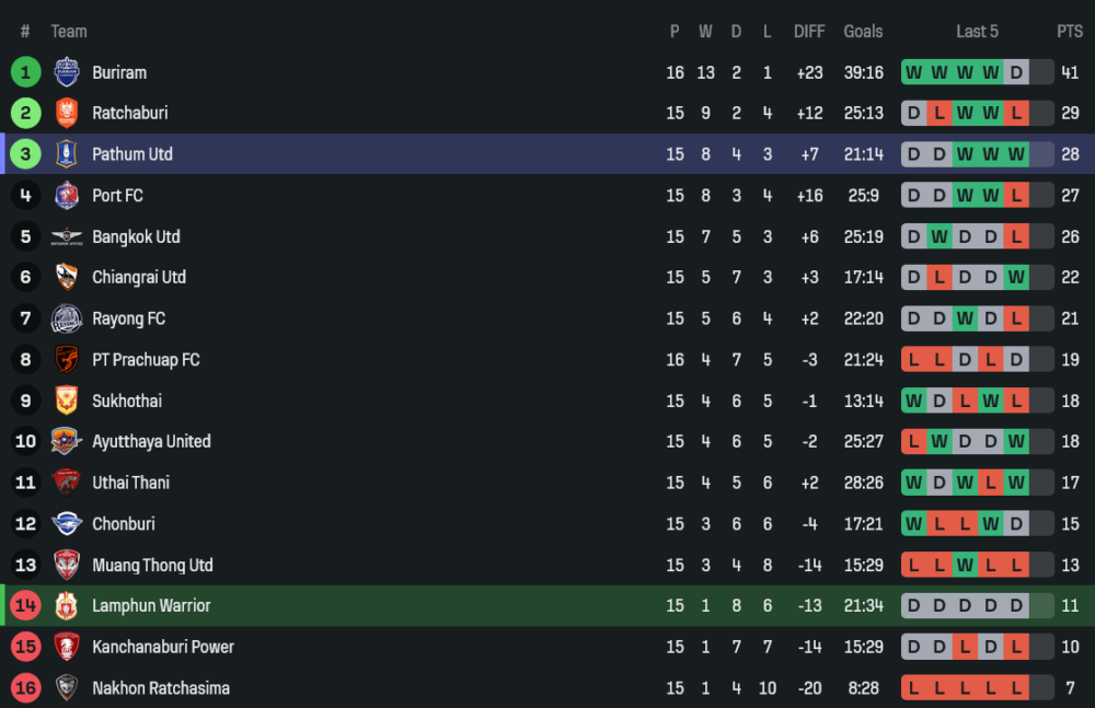 ตลอด 15 เกมในฤดูกาล Thai League T1 ปีนี้ ลำพูนเก็บไปได้ 1 ชัยชนะ 8 เสมอ และแพ้ 6 นัด เก็บเฉลี่ยประมาณ 0.73 คะแนนต่อเกม ตัวเลขอาจดูไม่หวือหวา แต่สะท้อนให้เห็นว่าทีมเสมอเยอะ แพ้ยากกว่าเดิมเมื่อเทียบกับช่วงเปิดซีซัน