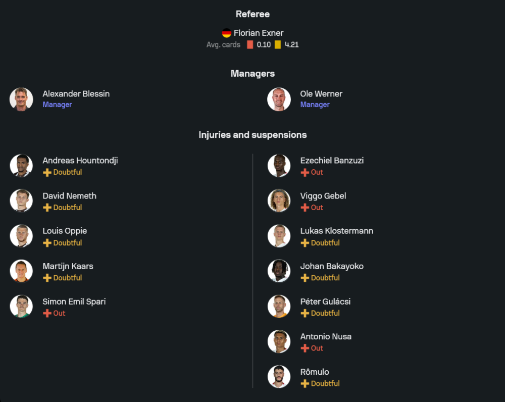 ฝั่งทีมเยือนของกุนซือ โอเล แวร์เนอร์ เพิ่งสะดุดแพ้ในลีกสองนัดติด ทำให้ต้องมากู้ศรัทธาในเกมนอกบ้านนัดนี้ แท็กติกหลักคือระบบ 4-3-3 ตามภาพไลน์อัพ ปีเตอร์ กูลาชี่ ยืนเป็นด่านสุดท้าย แม้จะถูกระบุว่ายังมีอาการเจ็บเล็กน้อยแต่พร้อมผ่านเช็กฟิตลงเฝ้าเสา แผงแบ็กโฟร์ใช้ ริดเดิล บากู ยืนฝั่งขวา คู่เซ็นเตอร์คือ วิลลี่ ออร์บาน จับคู่กับ กาสเตลโล ลูเกบา ส่วนแบ็กซ้ายเป็น ดาวิด รอม ที่ต้องช่วยเกมรุกริมเส้นให้ได้ด้วย แดนกลางวาง คริสตอฟ บอมการ์ตเนอร์ ประสานงานกับ นิโคลัส ไซวัลด์ และดาวรุ่งพลังสด อัสซัน อูเอดราโอโก้ สามประสานแดนหน้าจัดเต็มทั้ง คอนราด ฮาร์เดอร์ ที่ขยับมายืนริมเส้น, ทีเดี้ยม โกมิส ทางอีกฝั่ง และหัวหอกตัวความหวัง โรมูโล่ ยืนค้ำตรงกลาง แม้ทีมจะขาดแนวรุกอย่าง ยาน ดิโอม็องเด้ ที่ไปรับใช้ชาติ รวมถึงมีชื่ออย่าง เอเซเคียล บันซูซี วิกโก เกเบิล อันโตนิโอ นูซ่า และ โยฮัน บากาโยโก้ ในกลุ่มเดี้ยงหรือกึ่งฟิต แต่ด้วยขุมกำลังที่เหลือ ไลป์ซิกยังดูแน่นทั่วแผ่น