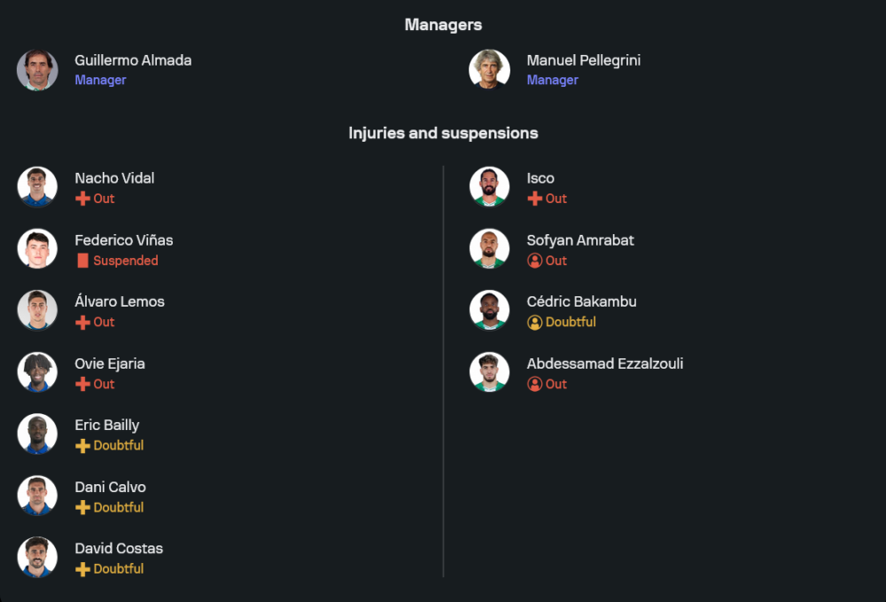 ทีมเยือนของกุนซือ มานูเอล เปเยกรินี่ มีข่าวร้ายแต่ไม่ถึงขั้นเสียกระดูกสันหลัง เมื่อเพลย์เมกเกอร์ตัวท็อปอย่าง อิสโก้ ยังต้องพักรักษาอาการบาดเจ็บ ขณะที่ โซฟิยาน อัมราบัต และ อับเดสซามัด เอซซัลซูลี เดินทางไปรับใช้ชาติลุยแอฟริกา คัพ ออฟ เนชั่นส์ ทำให้ตัวเลือกในแดนกลางและริมเส้นหายไปพอสมควร ด้าน เซดริก บากัมบู มีชื่อในกลุ่มสแตนด์บายหลังทีมชาติดีอาร์ คองโกตกรอบเช่นกัน แต่ยังต้องเช็กสภาพความฟิตก่อนเกม