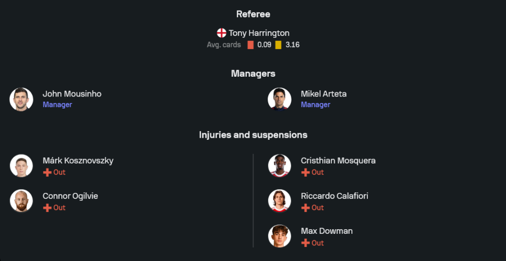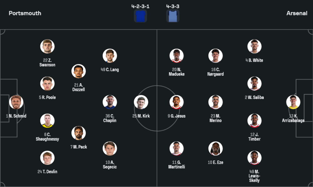 ด้านอาร์เซน่อลของ มิเกล อาร์เตต้า เดินทางมาแบบไม่เต็มสูบ มีรายชื่อผู้เล่นเดี้ยงค้างสต็อกจากข้อมูลล่าสุดอย่าง คริสเธียน มอสเกอร่า, ริคคาร์โด้ คาลาฟิออรี่ และ แม็กซ์ ดาวแมน ที่ยังต้องพักฟื้นต่อไป แต่ด้วยขนาดทีมที่ลึกและแน่น ทำให้กุนซือสแปนิชยังหมุนเวียนตัวได้สบาย คาดว่าจะจัดระบบ 4-3-3 ลงบู๊ ผู้รักษาประตูใช้ เกป้า อาร์ริซาบาลาก้า ยืนด่านสุดท้าย กองหลังสี่คนมี เบน ไวท์ ทางขวา วิลเลียม ซาลิบา จับคู่กับ เยอร์เรียน ทิมเบอร์ ในตำแหน่งเซ็นเตอร์ และ มายลส์ ลูอิส-สเคลลี่ ยืนแบ็กซ้าย แดนกลางสามคนประกอบด้วย คริสเตียน นอร์การ์ด คุมจังหวะ ร่วมกับ มิเกล เมริโน่ และ เอเบเรชี่ เอเซ่ ที่จะคอยพาบอลเชื่อมเกมขึ้นหน้า ส่วนแนวรุกฝากความหวังไว้ที่ โนนี่ มาดูเอเก้ ทางฝั่งขวา กาเบรียล เฮซุส ยืนหน้าเป้า และ กาเบรียล มาร์ติเนลลี่ ลากเลื้อยฝั่งซ้าย สามประสานที่พร้อมเล่นงานแนวรับพอร์ทสมัธทุกจังหวะ