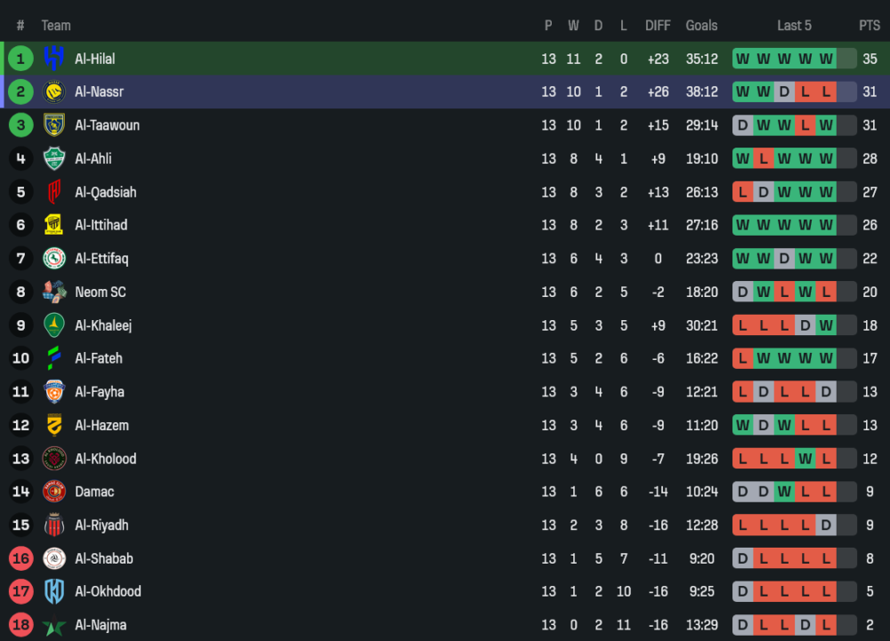 ในทางตรงกันข้าม อัล นาสเซอร์ หลังจากบินสูงหัวตารางมาตลอด ฟอร์มกลับตกฮวบในช่วงโค้งสำคัญ 6 นัดหลังรวมทุกรายการ ชนะเพียง 3 เสมอ 1 แพ้ 2 แต่ที่น่าห่วงคือในลีก พวกเขาไม่ชนะใครติดต่อกันสามเกม เก็บได้แค่แต้มเดียว เสียประตูไปถึง 7 ลูก เกินกว่าที่เคยเสียตลอด 10 สัปดาห์แรกของซีซันเสียอีก