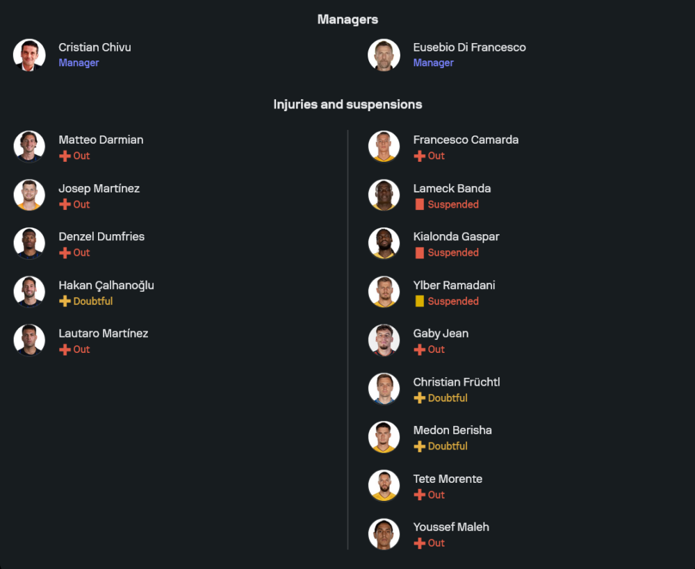 ฝั่งรายชื่อเจ็บ/ติดโทษแบน งูใหญ่ยังไม่มีชื่อของ มัตเตโอ ดาร์เมียน, โจเซป มาร์ติเนซ และ เดนเซล ดุมฟรีส์ ที่ถูกระบุว่า Out ในลิสต์อัปเดตล่าสุด ขณะที่ ฮาคาน ชัลฮาโนกลู กับ เลาตาโร่ เองถูกมองว่าอยู่ในกลุ่มเสี่ยง ต้องรอประเมินอีกครั้งก่อนเขี่ยบอล หากใครผ่านไม่ไหวก็มีตัวสแตนด์บายพร้อมลงอุดช่องว่างทันที