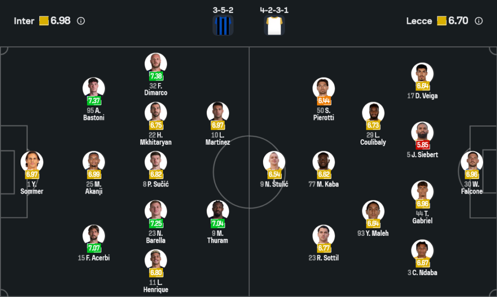 ฝั่งผู้มาเยือน ยูเซบิโอ ดิ ฟรานเชสโก้ วางระบบ 4-2-3-1 เน้นเกมรับแน่นแล้วรอโต้กลับ นำโดย วลาดิมิโร ฟัลโกเน่ เฝ้าเสา แผงหลังสี่คนมี เอ็นดาบา, กาเบรียล, ซีเบิร์ต และเวก้า ส่วนแนวรุกใช้ สตูลิช ยืนหอกเป้า โดยมี ปิเอร็อตติ, คูลิบาลี่ และซ็อตติล สนับสนุนจากด้านหลัง ภาพรวมจากเรตคะแนนของโซฟาสกอร์ อินเตอร์อยู่ที่ 6.98 ส่วนเลชเช่ 6.70 บ่งบอกชัดว่าศักยภาพตัวผู้เล่นเจ้าถิ่นเหนือกว่าอยู่พอสมควร