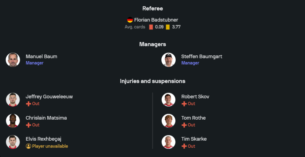 อย่างไรก็ตามกองเชียร์ยังพอมีเรื่องให้ยิ้ม เมื่อ ดิมิทริส จานนูลิส วิงแบ็กซ้ายตัวเก่งพร้อมกลับมาออกสตาร์ต และจะช่วยเติมเกมรุกทางริมเส้นได้อีกครั้ง แผนการเล่นหลักยังยึดระบบ 3-4-2-1 ผู้รักษาประตูใช้ ฟินน์ ดาห์เมน ยืนเฝ้าเสา สามเซ็นเตอร์แบ็กเป็น โนอาห์ แบงค์ เคเวน ชล็อตเตอร์เบ็ค และ เซดริค เซซิเกอร์ คู่กลางวาง ฮาน โนอาห์ มาสเซนโก้ ประสานงานกับ คริสติยัน ยาคิช ริมเส้นฝากความหวังไว้ที่ โรบิน เฟลล์เฮาเออร์ กับ จานนูลิส ส่วนเกมรุกด้านบนใช้ ฟาเบียน รีเดอ กับ อเล็กซิส โคล้ด มอริส ปั้นเกมอยู่หลังหัวหอกตัวเป้า ซามูเอล เอสเซนเด้ ที่เพิ่งกลับจากภารกิจทีมชาติและพร้อมล่าสกอร์ให้ทีม