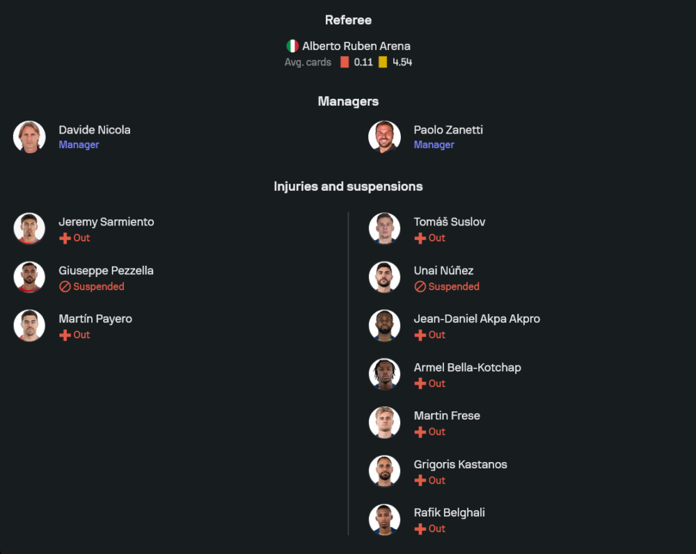 ฝั่งทีมเยือนเวโรน่าของเปาโล ซาเน็ตติ สภาพทีมต้องบอกว่าปวดหัวไม่น้อย เพราะมีแข้งเดี้ยงเต็มลิสต์ ไล่ตั้งแต่ อาร์เมล เบลล่า-ค็อตชัป, มาร์ติน เฟรเซ, ฌอง-ดาเนียล อัคปา-อัคโปร, โตมาส ซุสลอฟ ไปจนถึงกองหน้าอย่าง กริกอริส คาสตานอส ยังไม่พร้อมคืนสนาม แถม อูไน นูเญซ กองหลังตัวหลักดันโดนแบนจากการสะสมใบเหลืองครบอีกหนึ่งราย ทำให้กุนซือชาวอิตาเลียนต้องจัดแนวรับชุดผสมลงเล่น