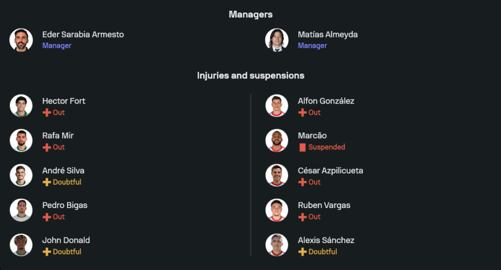 ปัญหาของเซบีย่าคืออาการบาดเจ็บและโทษแบนยังรุมเร้า หลายตัวหลักอย่าง รูเบน วาร์กัส, เซซาร์ อัซปิลิกวยต้า และ อัลฟอน กอนซาเลซ ยังเดี้ยงยาว ขณะที่ มาร์เกา ติดโทษแบน ส่วน อเล็กซิส ซานเชซ ต้องรอประเมินความฟิตอีกที ทำให้ตัวเลือกในเกมรับและเกมรุกถูกบีบให้จำกัดมากขึ้น