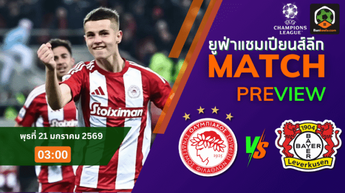 คืนวันพุธที่ 21 มกราคม 2569 เวลา 03.00 น. ตามเวลาไทย แฟนบอลต้องลุกมาดูอีกหนึ่งเกมเดือดของศึก ยูฟ่า แชมเปียนส์ ลีก เมื่อเจ้าถิ่น โอลิมเปียกอส แชมป์ลีกกรีซซีซั่นล่าสุด เปิดสังเวียน Stadio Georgios Karaiskaki รับการมาเยือนของทีมดุดันจากเมืองเบียร์อย่าง ไบเออร์ เลเวอร์คูเซ่น ในเกมรอบลีกเฟส นัดรองสุดท้าย ที่มีเดิมพันเป็นโอกาสลุ้นตั๋วเพลย์ออฟเข้ารอบ 16 ทีมสุดท้าย