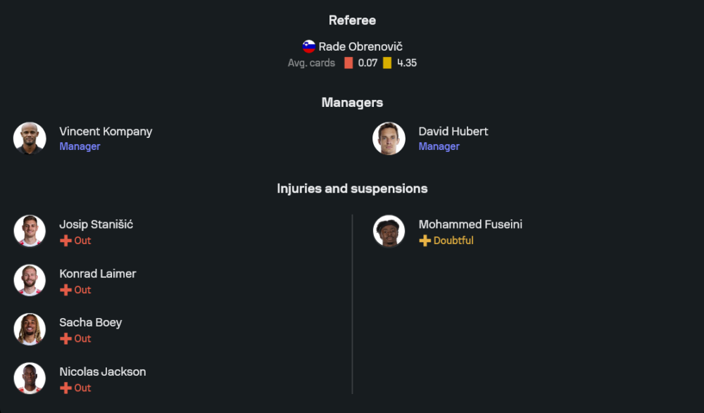 ตามข้อมูลจากไลน์อัพล่าสุด เสือใต้พร้อมจัดระบบ 4-2-3-1 ผู้รักษาประตูยังเป็น มานูเอล นอยเออร์ ยืนเฝ้าเสา แนวรับสี่คนใช้ ฮิโรกิ อิโตะ ทางซ้าย, โจนาธาน ทาห์ ยืนคู่กับ ดาโยต์ อูปาเมกาโน่ ในตำแหน่งเซ็นเตอร์ และ ราฟาเอล เกร์เรโร่ ขยับไปประจำการทางขวา แดนกลางคู่หูเชื่อมเกมเป็นหน้าที่ของ โจชัว คิมมิช จับคู่กับดาวรุ่งพลังหนุ่ม อเล็กซานเดอร์ พาฟโลวิช