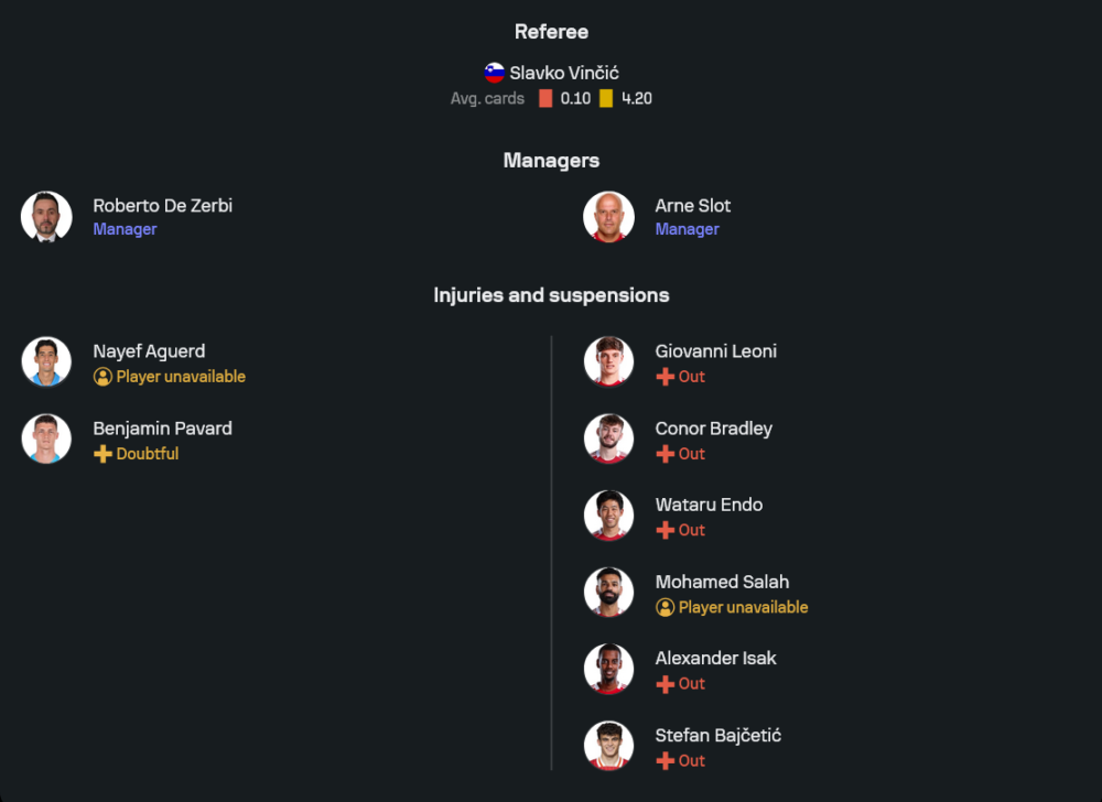 ฝั่งทีมเยือน อาร์เน่ สลอต ต้องแก้โจทย์ใหญ่เรื่องสภาพทีม เพราะมีแข้งเจ็บและไม่พร้อมใช้งานเพียบ ไล่ตั้งแต่ โจวานนี่ เลโอนี่, คอเนอร์ แบร็ดลี่ย์, วาตารุ เอ็นโด, สเตฟาน บายเซติช รวมถึงดาวยิงตัวความหวังอย่าง โมฮาเหม็ด ซาล่าห์ ที่ยังถูกระบุสถานะ “ไม่พร้อมลงสนาม” ขณะที่ อเล็กซานเดอร์ อิซัค ก็ยังเจ็บยาว