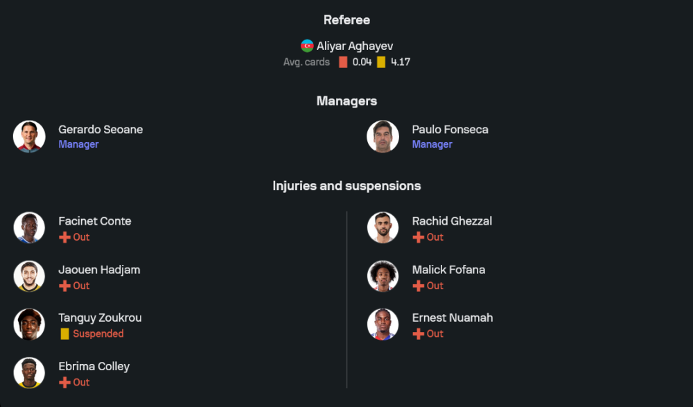 ลียงยังมีปัญหาตัวเจ็บสำคัญหลายราย ราชิด เกซซาล ยังพักรักษาอาการกล้ามเนื้อ, มาลิก โฟฟานา เจ็บข้อเท้า และเออร์เนสต์ นูอามาห์ ที่เดี้ยงยาวตั้งแต่ต้นปี 2025 ทำให้ฟอนเซกาต้องหมุนเวียนดาวรุ่งขึ้นมาแทน แต่จนถึงตอนนี้ก็ถือว่าทำได้ยอดเยี่ยม