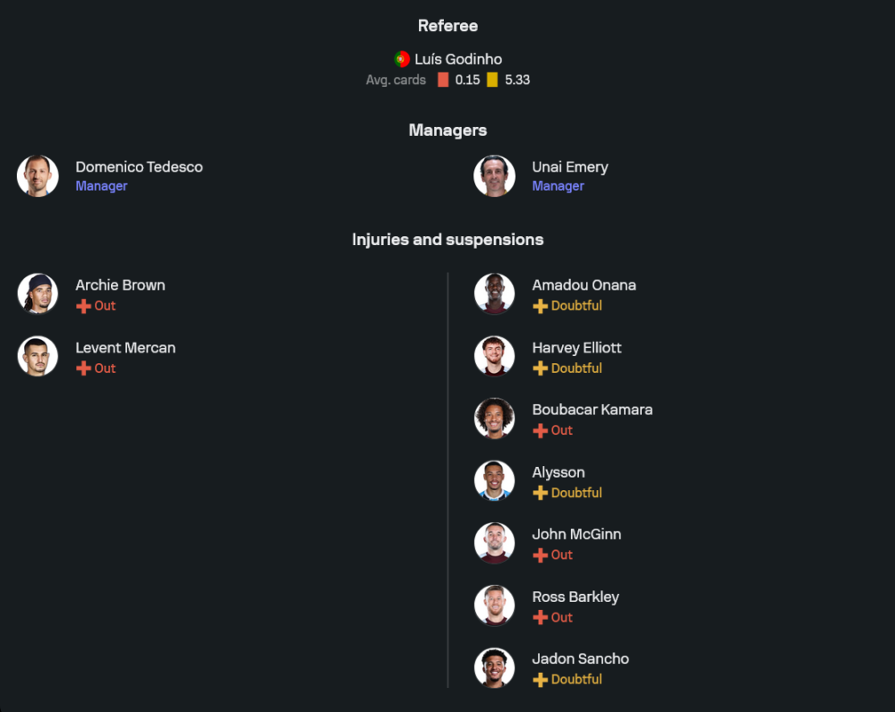 ด้านทีมเยือนแอสตัน วิลล่าของ อูไน เอเมรี่ ก็ยึดระบบ 4-2-3-1 เช่นกัน ผู้รักษาประตูใช้ มาร์โก บิซ็อต ยืนเฝ้าเสา แนวรับสี่คนจากขวาไปซ้ายคือ แม็ตตี้ แคช, เอซรี่ คอนซ่า, วิคตอร์ ลินเดอเลิฟ และ ลูก้าส์ ดีญ ซึ่งทั้งหมดมีทั้งประสบการณ์บอลยุโรปและพรีเมียร์ลีก คู่กลางเน้นสมดุลเกมรุกเกมรับวาง ยูริ ตีเลอม็องส์ จับคู่ มอร์แกน โรเจอร์ส ส่วนสามตัวรุกด้านหลังหน้าเป้าใช้ จาดอน ซานโช่ ลากเลื้อยทางซ้าย ลาแมร์ โบการ์ด เติมเกมจากกลางขึ้นไปเป็นตัวเชื่อม และ เอวานน์ เกาส์ซ็องด์ ป่วนทางขวา ขณะที่หัวหอกตัวเป้าฝากความหวังไว้ที่ โอลลี่ วัตกินส์ สภาพทีมต้องเช็กฟิต อมาดู โอนาน่า, ฮาร์วีย์ เอลเลียตต์ และ อลิสซง ส่วน บูบาก้าร์ กามาร่า, จอห์น แม็กกินน์ และ รอสส์ บาร์คลี่ย์ ยังบาดเจ็บหมดสิทธิ์ช่วยทีมแน่นอน