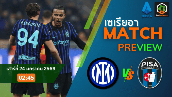ศึก กัลโช่ เซเรีย อา ค่ำคืนวันเสาร์ที่ 24 มกราคม 2569 แฟนบอลต้องห้ามกระพริบตา เมื่อจ่าฝูงอย่าง อินเตอร์ มิลาน เตรียมเปิดสังเวียนสตาดิโอ จูเซ็ปเป้ เมอัซซ่า ต้อนรับการมาเยือนของรองบ๊วยอย่าง ปิซ่า ทีมหนีตายที่กำลังดิ้นสุดแรงเพื่ออยู่รอด เกมนี้เตะกันเวลา 02.45 น. ตามโปรแกรมใน ตารางบอลวันนี้ ซึ่งถือเป็นหนึ่งในคู่ไฮไลต์ที่คอลูกหนังอิตาเลียนจับตามอง