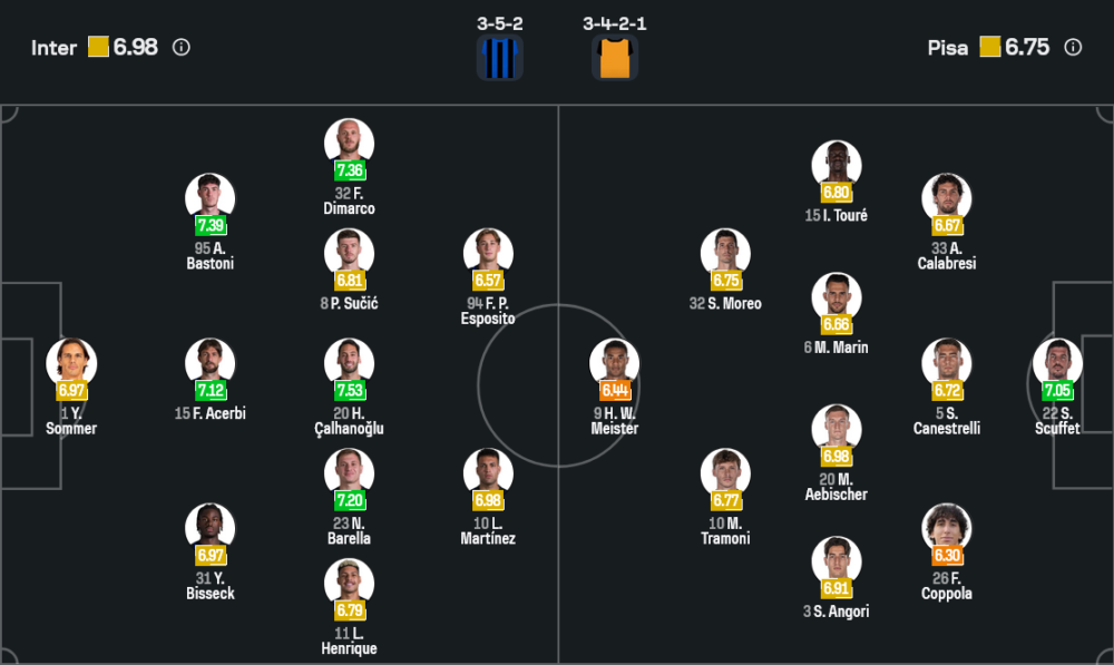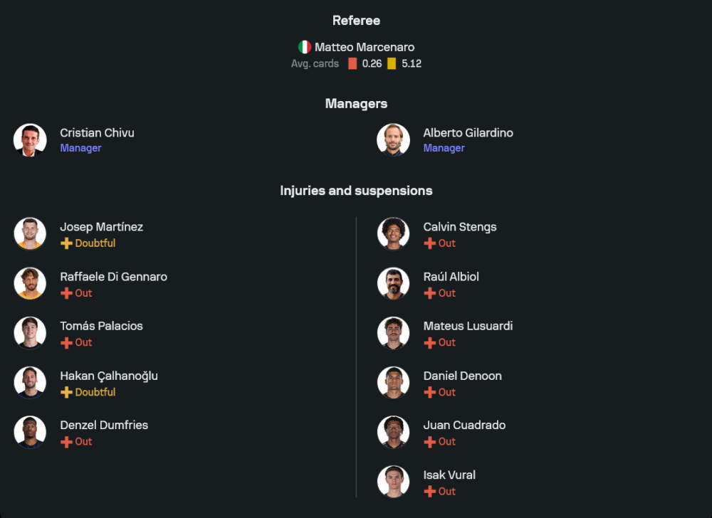 อินเตอร์ในยุคของกุนซือ คริสเตียน คิวู ยังต้องบริหารขุมกำลังกันเหนื่อย ไล่ตั้งแต่ผู้รักษาประตูสำรอง ราฟฟาเอเล ดิ เจนนาโร รวมถึงแนวรับอย่าง โทมัส ปาลาซิออส และ เดนเซล ดุมฟรีส์ ที่ยังเดี้ยงยาว ขณะที่จอมปั้นเกมอย่าง ฮาคาน ชัลฮาโนกลู มีปัญหากล้ามเนื้อ ถูกจัดให้อยู่ในกลุ่มต้องลุ้นความฟิต แม้ชื่อของเขายังสำคัญต่อแท็กติกอย่างยิ่ง อย่างไรก็ตาม โครงสร้างหลักในระบบ 3-5-2 ยังอยู่กันครบ ยานน์ ซอมเมอร์ เฝ้าเสา สามปราการหลังเป็น ยานน์ บิสเซ็ค, ฟรานเชสโก้ อแซร์บี้ และ อเลสซานโดร บาสโตนี่ วิงแบ็กสองฝั่งใช้ หลุยส์ เฮนริเก้ กับ เฟเดริโก้ ดิมาร์โก้ กลางสนามฝากความหวังไว้ที่ นิโคโล่ บาเรลล่า ผนึกกำลัง เปตาร์ ซูชิช และหนึ่งในจอมทัพที่พร้อมลงช่วย ส่วนคู่หัวหอกเป็น ฟรานเชสโก้ ปิโอ เอสโปซิโต้ ประสานกับ เลาตาโร่ มาร์ติเนซ กัปตันทีมที่กำลังล่าเพิ่มจากผลงาน 8 ประตูในลีกซีซั่นนี้