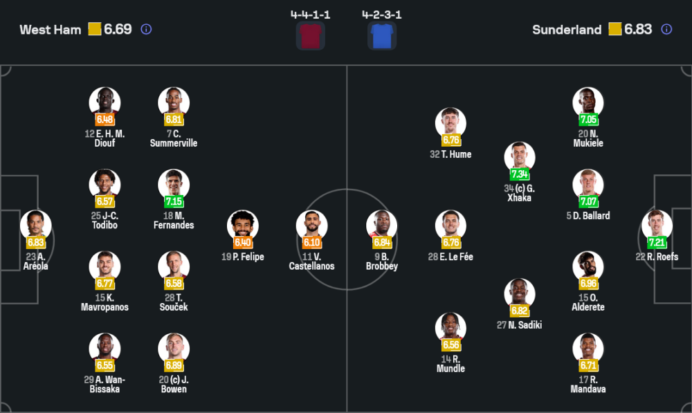 จากภาพจัดตัวล่าสุด เวสต์แฮมปรับหมากมาใช้ระบบ 4-4-1-1 เน้นเกมรัดกุมแต่เปลี่ยนจังหวะบุกได้รวดเร็ว แผงหลังมี เอล ฮาจ มาลิก ดิยุฟ ประจำการฝั่งซ้าย คู่เซ็นเตอร์เป็น ฌ็อง-แคลร์ โตดิโบ ยืนคู่กับ คอนสแตนตินอส มาฟโรปานอส ด้านขวาเป็น อารอน วาน-บิสซาก้า ฟูลแบ็กที่พร้อมเติมเกมซ้ำแล้วซ้ำเล่า กลางคู่กลางส่ง มาเตอุส แฟร์นานเดส จับคู่กับ โตมาช ซูเช็ค ที่เป็นตัวชนหลักของทีม