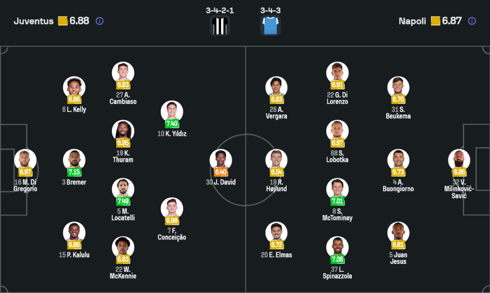ฝั่งเจ้าบ้านอย่างม้าลาย สปัลเล็ตติยังต้องปวดหัวกับปัญหาแข้งเดี้ยงยาว ตัวหลักที่หายหน้าไปก่อนหน้าอย่าง ดานิเอเล รูกานี่, ดูซาน วลาโฮวิช, อาร์คาดิอุส มิลิค รวมถึงดาวรุ่งอย่าง โจนาส รูฮี ยังไม่พร้อมคืนสนามทั้งหมด ทำให้ตัวเลือกแนวรับและกองหน้าถูกจำกัดพอสมควร จากภาพไลน์อัพล่าสุด สปัลเล็ตติเลือกใช้ระบบ 3-4-2-1 กองหลังสามคนใช้ ลอยด์ เคลลี่ จับคู่กับ เบรเมร์ และ ปิแอร์ คาลูลู ยืนแพ็กกลางกรอบเขตโทษ วิงแบ็กสองฝั่งมี อันเดรีย คัมเบียโซ ทางซ้าย และ เวสตัน แม็คเคนนี่ ทางขวา คู่กลางใช้ มานูเอล โลคาเตลลี่ เล่นร่วมกับ เคเฟรน ตูราม ขณะที่แดนบนวาง เคนาน ยิลดิซ กับ ฟรานซิสโก้ คอนไซเซา คอยสร้างสรรค์เกมรุกอยู่ด้านหลังกองหน้าตัวเป้าอย่าง โจนาธาน เดวิด ที่ฟอร์มกำลังร้อนแรง