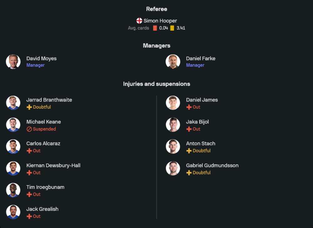 อย่างไรก็ดี 11 ตัวจริงที่คาดว่าจะลงสนามยังดูแข็งแกร่ง ระบบ 4-2-3-1 ยังคงใช้ จอร์แดน พิคฟอร์ด ยืนเฝ้าเสา แผงแบ็กโฟร์จากขวาไปซ้าย นาธาน แพ็ตเตอร์สัน, เจมส์ ทาร์คอฟสกี้, เจค โอไบรเอน และ วิตาลี่ มีโคเลนโก้ คู่มิดฟิลด์เชิงรับวาง อิดริสซ่า กูเอเย่ จับคู่กับ เลนี เอ็นดิอาย ให้สามตัวรุกด้านหลังหอกเป็น ดไวท์ แม็กนีล, เจมส์ การ์เนอร์ และ แฮร์รี่ อาร์มสตรอง ปั้นเกมสนับสนุน ธีเออร์โน่ แบร์รี่ ศูนย์หน้าตัวเป้าที่พร้อมวิ่งกดดันแนวรับทีมเยือนทั้งเกม
