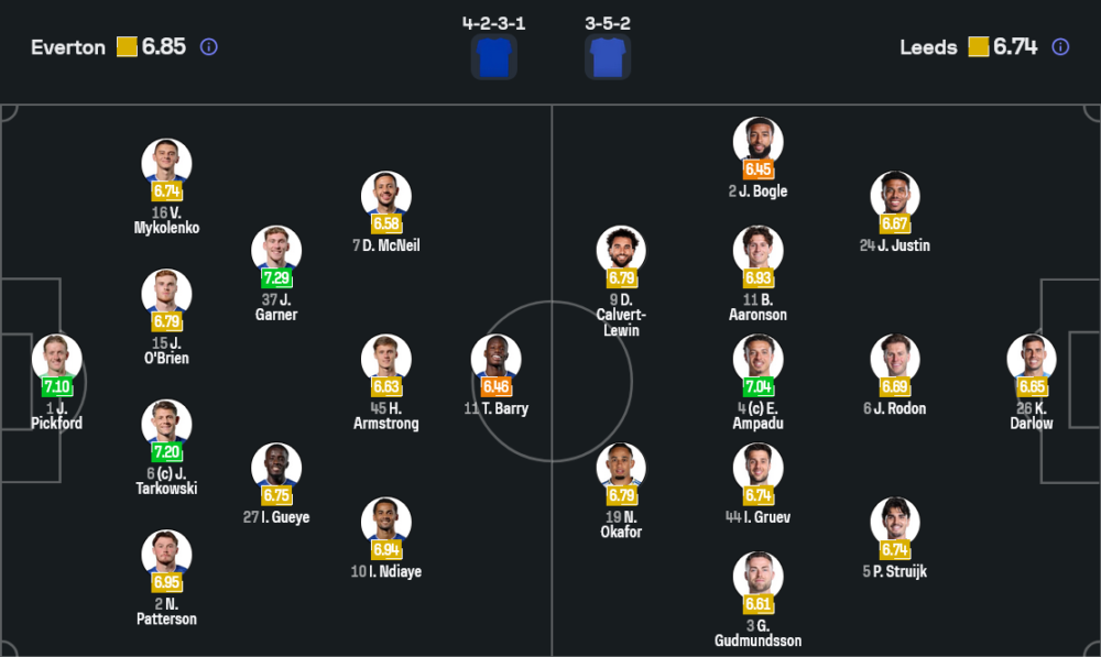 ลีดส์น่าจะยึดระบบ 3-5-2 ผู้รักษาประตูใช้ คาร์ล ดาร์โลว์ ยืนด่านสุดท้าย แผงหลังสามคนประกอบด้วย กุ๊ดมุนด์สสัน, ปาสกาล สเตราย์ค และ โจ โรดอน วิงแบ็กขวาเป็น เจย์เดน โบเกิล ฝั่งซ้ายใช้ เจมส์ จัสติน แดนกลางวาง ลูคัส กรูเยฟ คอยเชื่อมเกมร่วมกับ อีธาน แอมปาดู กัปตันทีม และ เบรนเด้น อารอนสัน ส่วนแดนหน้าโดดเด่นด้วยคู่หอกความเร็วสูง โดมินิก คัลเวิร์ต-เลวิน จับคู่ โนอาห์ โอคาฟอร์ ที่พร้อมลากเลื้อยเล่นงานแนวรับเจ้าบ้านตลอด 90 นาที