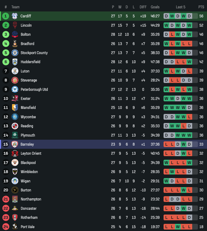 บาร์นสลี่ย์เพิ่งบุกเสมอเร้ดดิ้ง 2-2 แบบได้ลุ้นถึงสามแต้ม ก่อนจะจบด้วยการแบ่งแต้ม ถือเป็นผลการแข่งขันที่ช่วยขยับความมั่นใจขึ้นมาเยอะ ก่อนหน้านั้นเปิดบ้านเชือดแบล็คพูล 2-1 ส่วนเกมเอฟเอ คัพ แม้จะบุกพ่ายลิเวอร์พูล 1-4 แต่รูปเกมก็สู้ได้สมศักดิ์ศรี ทีมระดับลีก วัน เจอของแข็งอย่างหงส์แดงแล้วเสียประตูแค่สี่ลูกถือว่าไม่เลว ขณะที่ก่อนปีใหม่พวกเขาเสมอวีแกน 1-1 และแพ้ลินคอล์น 0-2 คาบ้าน