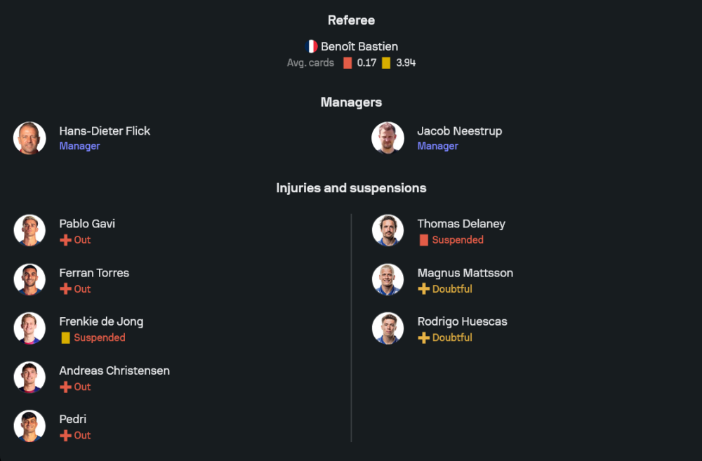 ลูกทีมของกุนซือฮานส์-ดีเทอร์ ฟลิค กำลังมั่นใจหลังเก็บชัยในทุกรายการอย่างต่อเนื่อง แต่ข่าวร้ายคือยังต้องขาดขุมกำลังสำคัญหลายรายตั้งแต่แดนกลางถึงแนวรับ เปดรี, กาบี และเฟร์ราน ตอร์เรส ยังเดี้ยงต่อเนื่อง ขณะที่เฟรงกี้ เดอ ยอง ติดโทษแบน รวมถึงอันเดรียส คริสเตนเซ่นก็ยังไม่พร้อมลงสนาม ทำให้ตัวเลือกเกมรับและแดนกลางหดสั้นลงพอสมควร