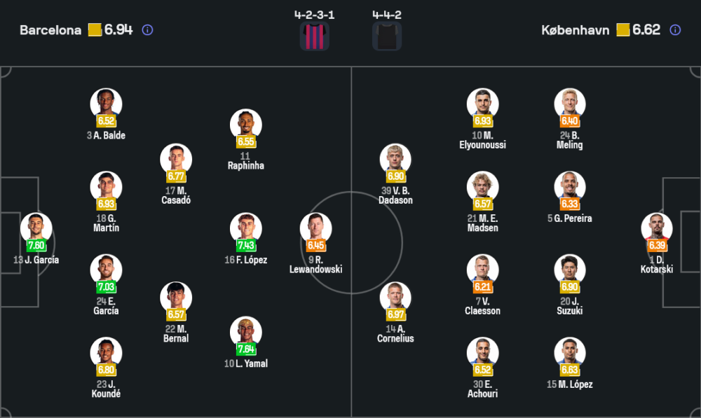 อย่างไรก็ตาม โครงสร้างหลักยังจัดเต็มในระบบ 4-2-3-1 ตามภาพจากไลน์อัพล่าสุดที่คัมป์ นู ผู้รักษาประตูใช้ โจน การ์เซีย ยืนเฝ้าเสา แผงแบ็กโฟร์จากซ้ายไปขวา อเลฆานโดร บัลเด้, เคราร์ด มาร์ติน, เอริค การ์เซีย และ ฌูลส์ คุนเด้ คู่มิดฟิลด์ตัวรับวาง มาร์ก เบร์นาล จับคู่ เฟร์มิน โลเปซ คอยคุมจังหวะเกมรุกเกมรับ ส่วนสามตัวรุกด้านหลังหอกมี มาร์ก กาซาโด้ ขับเคลื่อนตรงกลาง ขนาบด้วย ราฟินญ่า ทางขวา และลามีน ยามาล ดาวรุ่งอนาคตไกลทางด้านซ้าย ปล่อยให้ โรเบิร์ต เลวานดอฟสกี้ ยืนหน้าเป้าคอยล่าตาข่ายตามสไตล์จอมสังหารในกรอบเขตโทษ