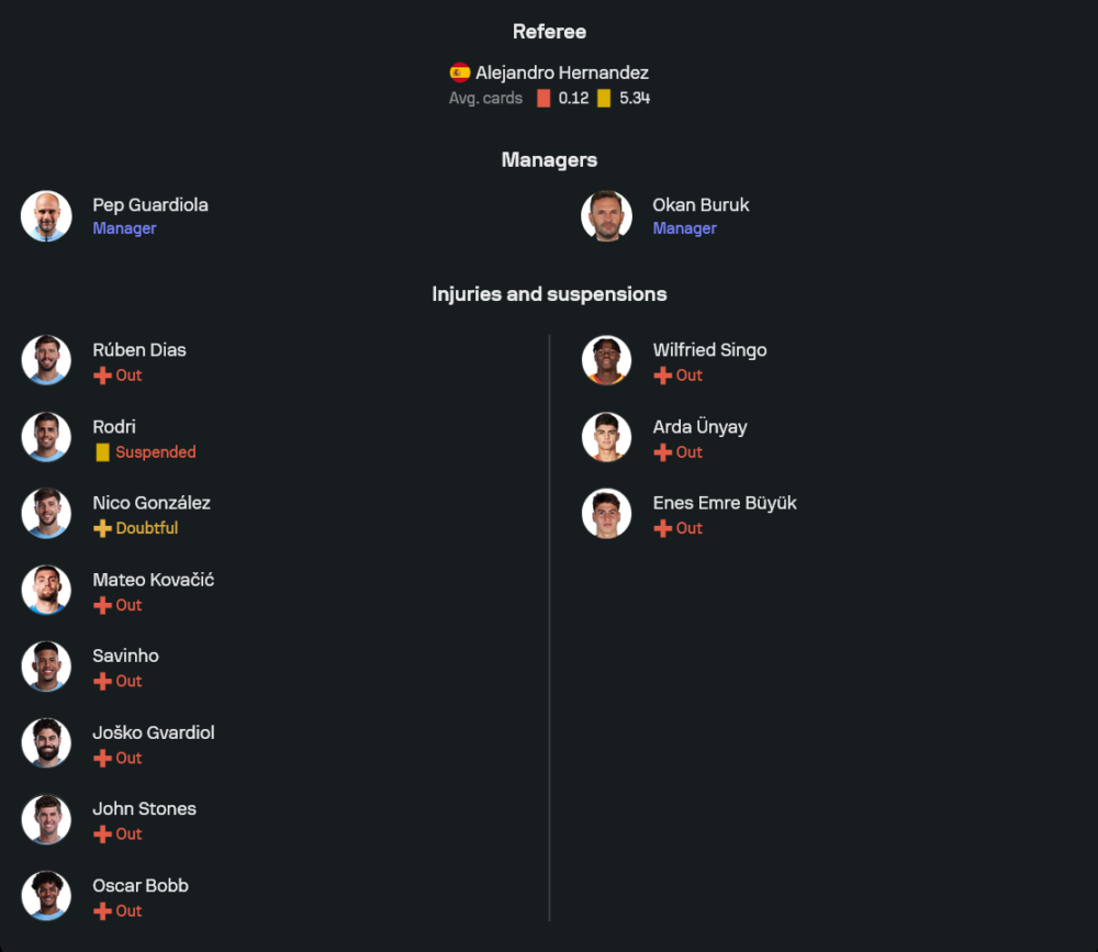 ทัพเรือใบของ เป๊ป กวาร์ดิโอล่า มีปัญหาตัวผู้เล่นให้กังวลพอสมควร รายชื่อแข้งเดี้ยงยาวเป็นหางว่าวทั้ง รูเบน ดิอาส, จอห์น สโตนส์, ยอสโก้ กวาร์ดิโอล, มาเตโอ โควาซิช, ซาวินโญ่ รวมถึง ออสการ์ บ็อบบ์ ขณะที่ โรดรี ยังติดโทษแบน ทำให้แดนกลางเสียห้องเครื่องคนสำคัญไปหนึ่ง นอกจากนี้ นิโค กอนซาเลซ ยังถูกประเมินว่า “เสี่ยงไม่เต็มร้อย” ส่วนบางรายอย่าง มาร์ก เกอี และ อ็องตวน เซเมนโย่ ไม่ได้ลงทะเบียนในรายการนี้