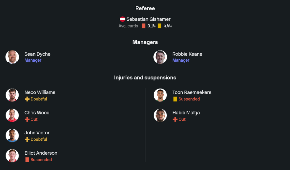 สภาพทีมมีปัญหาเล็กน้อยแนวรับฝั่งขวาอย่าง เนโก วิลเลียมส์ กับแนวรุกสายสปีด จอห์น วิกตอร์ ยังอยู่ในกลุ่มเช็กฟิต ขณะที่ คริส วู้ด หัวหอกจอมเก๋าต้องพักยาว ส่วน เอลเลียต แอนเดอร์สัน มิดฟิลด์คนสำคัญโดนโทษแบน ทำให้ไดช์ต้องปรับแดนกลางเล็กน้อยแต่ภาพรวมยังดูแน่น
