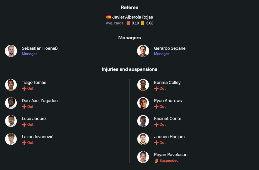 อย่างไรก็ตาม เจ้าถิ่นยังต้องเช็กชื่อแข้งบาดเจ็บที่หายหน้าไปต่อเนื่องอย่าง ติอาโก้ โตมาส, ดาน-แอ็กเซล ซากาดู, ลูก้า ฆาเกซ และ ลาซาร์ โยวาโนวิช ทั้งหมดถูกระบุว่า “Out” ในลิสต์ก่อนเกม แต่ด้วยขนาดทีมที่ลึกพอสมควร ทำให้การจัดทัพนัดนี้ไม่ได้รับผลกระทบหนักนัก