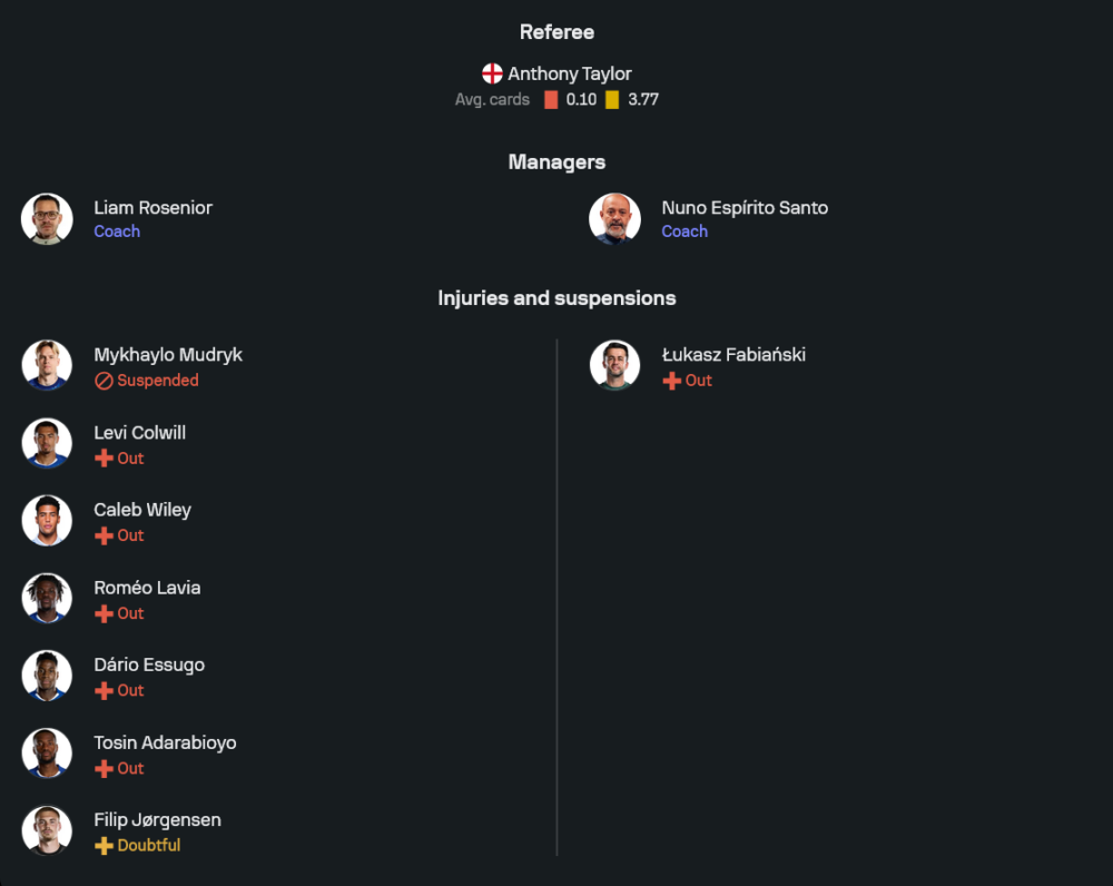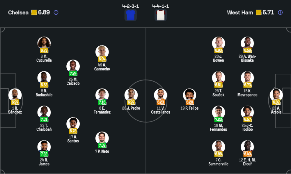 คู่มิดฟิลด์ตัวรับเป็น มอยเซส ไกเซโด ประสานงานกับ อังเดร ซานโตส แถวสองใช้ เอ็นโซ เฟร์นานเดซ เดินเกมร่วมกับ เปโดร เนโต้ และ ชูเอา เปโดร หน้าเป้าให้ อเลฆานโดร การ์นาโช่ รับบทจบสกอร์ ซึ่งกำลังมั่นใจหลังโชว์ฟอร์มเด่นในหลายเกมล่าสุด