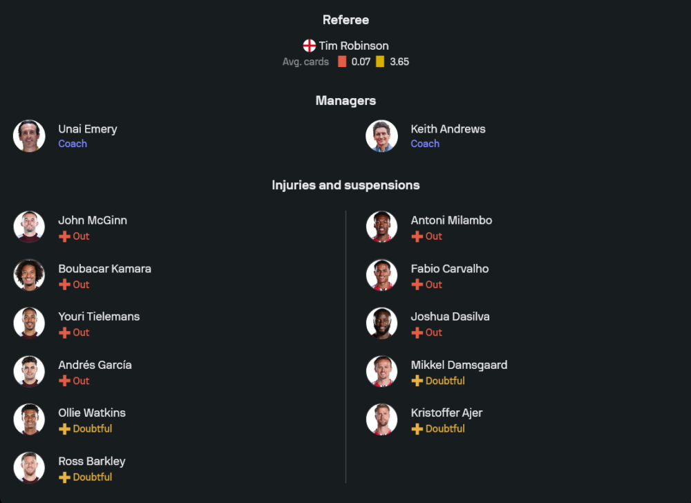 อย่างไรก็ดี วิลล่าต้องขาดแกนหลักหลายราย ทั้งจอห์น แม็กกินน์, บูบาก้าร์ กามาร่า, ยูรี่ ตีเลอม็องส์ และอันเดรส การ์เซีย ที่บาดเจ็บยาว รวมถึงกองหน้าอย่างอลิสซอน ขณะที่ โอลลี่ วัตกิ้นส์ กับ รอสส์ บาร์คลี่ย์ ยังอยู่ในกลุ่มเช็คความฟิต ก่อนเกมจะรู้กันว่าใครพร้อมมีชื่อบนม้านั่งสำรอง