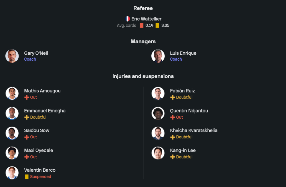 แดนกลางสามตัวใช้ วาร์เรน แซร์ร์ เเมรี่, วิตินญา และ เชา เนเวส เป็นหัวใจในการคุมจังหวะ เกมรุกฝากความหวังไว้กับสามประสานแนวรุก ดานี่ ดูเอ้ ทางฝั่งซ้าย, อุสมาน เดมเบเล่ ทางขวา และ แบรดลีย์ บาร์กอลา ที่กำลังมั่นใจหลังเพิ่งซัดประตูสำคัญในเกมลีกล่าสุด แม้ทีมจะมีปัญหาความฟิตของ ฟาเบียน รูอิซ, ควิชา ควารัตสเคเลีย และ อี คังอิน ที่ส่อแววพลาดลงสนาม รวมถึง ก็องแต็ง เอ็นฌ็องตู ที่เจ็บกล้ามเนื้อ แต่ด้วยขุมกำลังที่ลึกและแน่น ทำให้โค้ชชาวสเปนยังมีตัวเลือกหมุนเวียนเพียงพอ