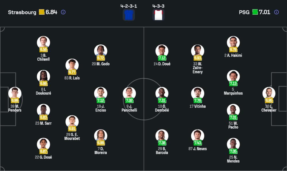 ฝั่งทีมเยือน หลุยส์ เอ็นรีเก จัดทัพในระบบ 4-3-3 ตามสไตล์เน้นครองบอลจากแดนกลาง เชฟาลิเยร์ รับหน้าที่เฝ้าเสา แนวรับสี่คนประกอบด้วย อาชราฟ ฮาคิมี ทางขวา คู่เซ็นเตอร์เป็น มาร์กินญอส กับ วีลเลี่ยม ปาโช ขณะที่ฝั่งซ้ายเป็น นูโน เมนเดส ที่เติมเกมบุกได้ลื่นไหล