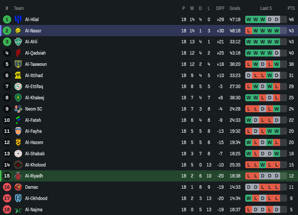สถานการณ์ของอัล ริยาดห์ในลีกถือว่าน่าเป็นห่วงอย่างยิ่ง พวกเขารั้งอันดับ 15 มีเพียง 12 แต้มจาก 18 นัด ห่างโซนตกชั้นแค่แต้มเดียวเท่านั้น ฟอร์มช่วงหลังไม่ชนะใครในลีก 13 นัดติดต่อกัน แบ่งเป็นเสมอถึง 6 นัดและแพ้ 7 เกม แนวรับคือจุดเปราะบางสุดๆ เมื่อเสียไปแล้วถึง 38 ประตู มากที่สุดในลีก ขณะที่ยิงได้เพียง 18 ลูกเท่านั้น เกมล่าสุดบุกไปเสมออัล นัจมาห์ 1-1 แม้จะได้แต้ม แต่ก็ยังสะท้อนปัญหาเดิมคือปิดบัญชีคู่แข่งไม่คม และเสียประตูง่ายเกินไป หากไม่รีบแก้ไข เกมหนีตกชั้นปลายฤดูกาลอาจหนักหนาสาหัสกว่านี้