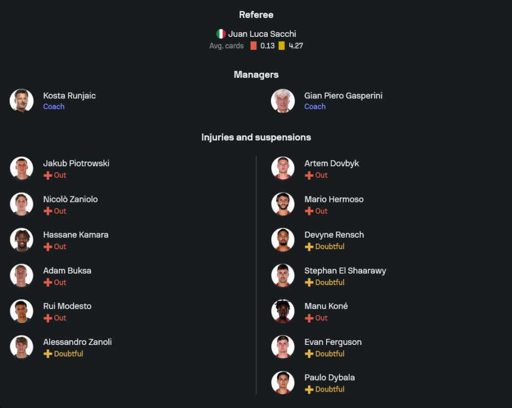 ฝั่งทีมเยือนของ จานปิเอโร่ กัสเปรินี่ มีโจทย์ใหญ่ให้ต้องคิดเยอะกว่า เมื่อมีทั้งตัวเจ็บและตัวเช็กฟิตเพียบ เริ่มจาก อาร์เตม ดอฟบิค และ มาริโอ เอร์โมโซ่ ที่ชวดลงแน่นอน รวมถึง มานู โกเน่ ที่ยังไม่พร้อม ส่วน เดฟวีน แรนช์, สเตฟาน เอล ชาราวี, อีแวน เฟอร์กูสัน และ เปาโล ดีบาล่า ถูกประเมินเป็นตัว “เสี่ยงสูง” ต้องเช็กสภาพร่างกายก่อนลงสนามแบบละเอียด