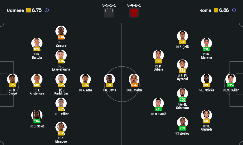 จุดที่โรม่าอาจต้องระวังคือลูกสวนกลับและลูกตั้งเตะของอูดิเนเซ่ ซึ่งมักทำได้ดีเมื่อเล่นในบ้าน บอลครอสจากริมเส้นของเซมูร่าหรือเอฮิซิเบวร่วมกับความแข็งแกร่งในอากาศของเดวิส ทำให้แนวรับหมาป่ากรุงโรมต้องมีสมาธิตลอดเวลา ขณะเดียวกันหากเกมนี้ดีบาล่าได้ลงจริงแม้จะมีอาการล้า เขายังเป็นคนที่สร้างความแตกต่างได้เสมอทั้งลูกยิงไกลและฟรีคิก การดวลแท็กติกของสองกุนซือจะเข้มข้นไม่แพ้คุณภาพนักเตะในสนามอย่างแน่นอน