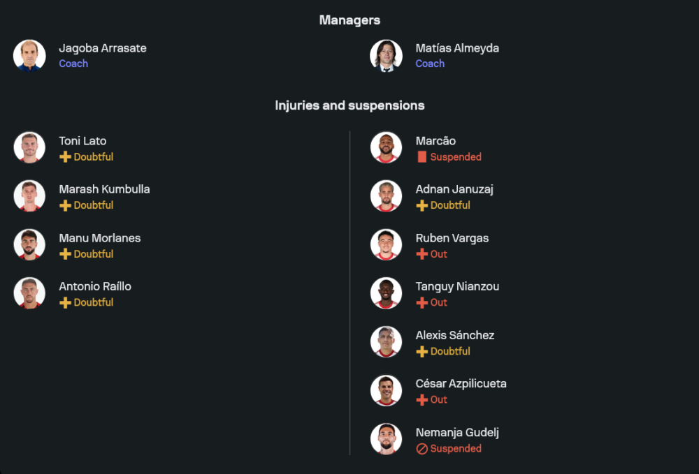 ปัญหาคือเซบีย่าต้องเสียกำลังหลักไปหลายรายจากโทษแบนและอาการบาดเจ็บ มาร์กเซา และ เนมานย่า กูเดลจ์ ติดโทษห้ามลงสนาม ขณะที่ รูเบน วาร์กัส, ต็องกีย์ นียงซู และ เซซาร์ อัซปิลิกวยต้า เจ็บยาว ส่วน อเล็กซิส ซานเชซ กับ อัดนาน ยานูไซ ยังถูกจัดอยู่ในกลุ่มเสี่ยง ต้องรอประเมินฟิตขั้นสุดท้ายก่อนตัดสินใจส่งลงสนาม