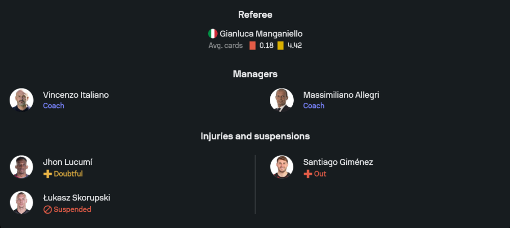 จุดที่ต้องจับตาคือการดวลตัวต่อตัวระหว่าง เลเอา กับ เฮกเกม / ซอร์เตอา หากแนวรับเจ้าบ้านอ่านเกมผิดเพียงครั้งเดียว มีสิทธิ์โดนลงโทษทันที นอกจากนี้การที่มิลานยังไม่แพ้เกมเยือนในลีกก็ยิ่งเพิ่มความมั่นใจให้ทีมของ อัลเลกรี ว่าสามารถบุกมาเก็บสามคะแนนได้ แม้โบโลญญ่าจะอาศัยเสียงเชียร์แฟนบอลและจังหวะสวนกลับจาก ออร์โซลินี่ กับ กาสโตร คอยวัดความผิดพลาด แต่ประสบการณ์ในเกมใหญ่ของแนวรับทีมเยือนยังดูแน่นกว่า