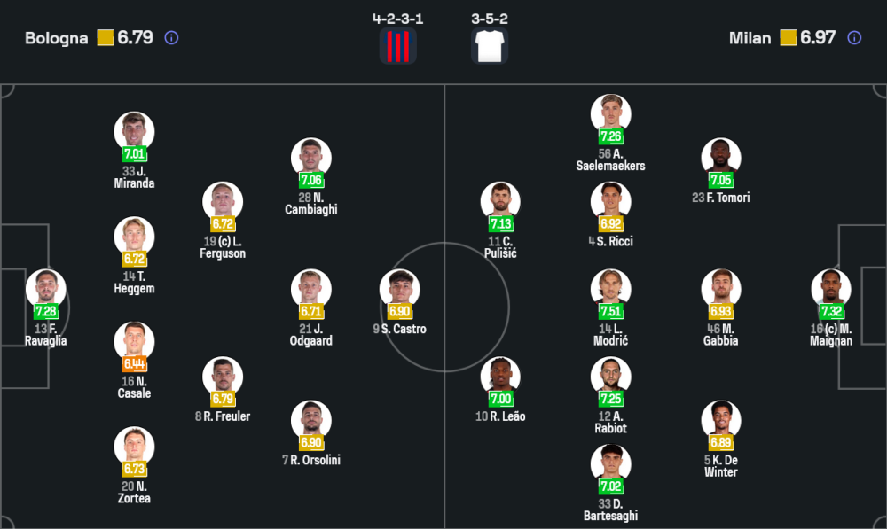 ส่วน เอซี มิลาน จะใช้จุดเด่นเรื่องการคุมจังหวะเกมกลางสนาม และการเปลี่ยนสปีดจากช้าสู่เร็วในการเข้าทำ โมดริช จะเป็นตัวคุมเม็ดจ่ายสำคัญ วางบอลออกปีกให้ แซเลแมเกอร์ส กับ บาร์เตซากี เติมขึ้นมาซ้อนสร้างสถานการณ์สองต่อหนึ่งทางริมเส้น ขณะที่ เลเอา จะหุบเข้ากลางไปเล่นระหว่างแนวรับกับแดนกลางของโบโลญญ่า เปิดพื้นที่ให้ พูลิซิช สอดเข้าไปรับบอลทะลุช่อง