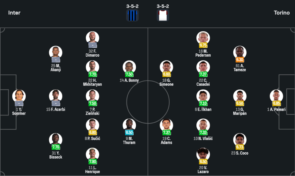 ฝั่งอินเตอร์กำลังมั่นใจสุดขีด ชนะรัวๆ ทั้งในลีกและยุโรป เกมนี้เฮดโค้ช คริสเตียน ชิวู พร้อมส่งชุดผสมที่ยังคงดุดันลงสนาม นำโดย ยานน์ ซอมเมอร์ เฝ้าเสา แนวรับสามประสาน บิสเซ็ค, อแชร์บี้ และ อาคานยี วิงแบ็กสองฝั่ง หลุยส์ เอ็นริเก้ กับ เฟเดริโก้ ดิมาร์โก้ เติมเกมรุกแบบจัดเต็ม กลางสนามใช้ ปิโอตอร์ ซีลินสกี้, เปตาร์ ซูชิช และ เฮนริคห์ มคิตาร์ยาน ขับเคลื่อนเกม ส่วนแดนหน้าจัดคู่หู มาร์คัส ตูราม กับ อองเดร บอนนี่ ล่าตาข่ายในระบบ 3-5-2 ที่กำลังลงตัว