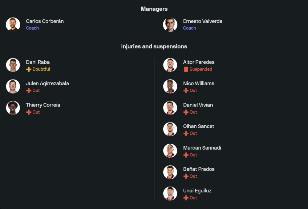 ฝั่งบิลเบาต้องพึ่งจังหวะสวนกลับและความเฉียบคมของวิลเลี่ยมส์กับกูรูเซต้าเป็นหลัก การที่มีตัวเจ็บเพียบทำให้การหมุนเวียนผู้เล่นค่อนข้างจำกัด หากเกมนี้ต้องยืดเยื้อไปถึงช่วงต่อเวลาอาจส่งผลต่อสภาพร่างกายอย่างเลี่ยงไม่ได้ จุดสำคัญคือการป้องกันลูกครอสด้านข้างและลูกเซตพีซ หากยังแก้ปัญหาตรงนี้ไม่ได้มีโอกาสโดนเจ้าถิ่นลงโทษแน่นอน