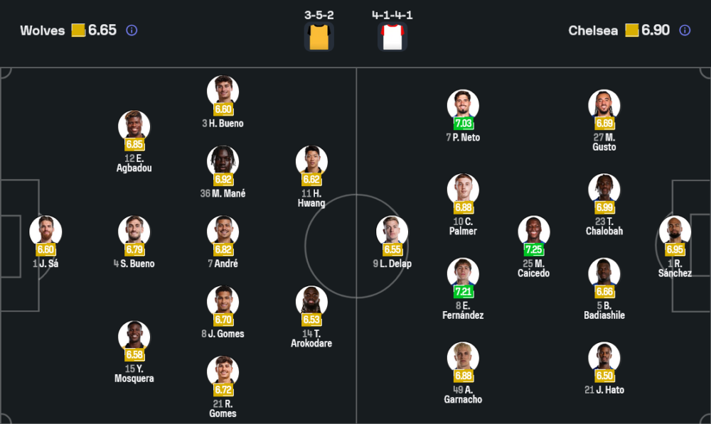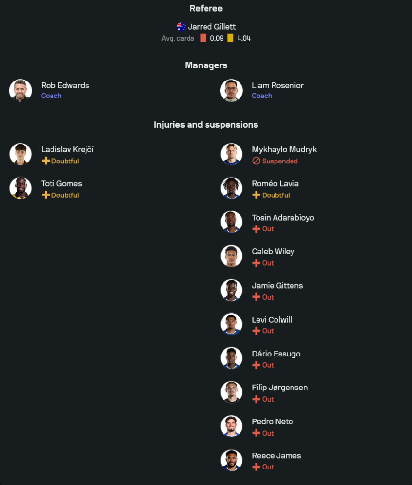ฝั่งเชลซีของ โรซีเนียร์ แม้สภาพทีมไม่สมบูรณ์ที่สุดแต่โดยรวมยังดูพร้อมกว่า เจ้าบ้าน ตัวหลักอย่าง โตซิน อาดาราบิโอโย่ และ เลวี่ โคลวิลล์ ยังเจ็บยาว รวมถึง โรเมโอ ลาเวีย ที่เพิ่งลงสนามในลีกได้ไม่กี่นัด ขณะที่แข้งหนุ่มอย่าง เจมี่ กิตเท่นส์, คาลеб ไวลีย์ และ ดาริโอ เอซซูโก้ ยังต้องพักต่ออีกระยะ ส่วน มิคไฮโล มูดริก ติดโทษแบน เกมนี้จึงต้องฝากแนวรับไว้กับ ชาโลบาห์ จับคู่ บาเดียชิล โดยมี กุสโต้ กับ กูกูเรญ่า ขนาบข้าง คู่มิดฟิลด์ เฟร์นานเดซ สลับเกมกับ ไซเซโด้ เพื่อปล่อย พัลเมอร์ และ การ์นาโช่ ปั้นเกมรุกด้านหลัง ดีแล็ป ที่พร้อมวิ่งกดดันแนวรับเจ้าบ้านตลอดทั้งเกม รูปแบบ 4-1-4-1 ของสิงห์บลูส์ถือว่าลงตัวอย่างยิ่งในช่วงหลัง