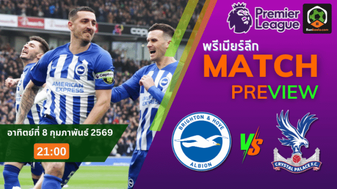 ศึก พรีเมียร์ลีก คู่ดึกคืนวันอาทิตย์ที่ 8 กุมภาพันธ์ 2569 เวลา 21.00 น. ตามเวลาไทย แฟนบอลในหน้า ตารางบอลวันนี้ ต้องไม่พลาดเกมร้อนแรงที่เอเม็กซ์ สเตเดี้ยม เมื่อเจ้าถิ่น ไบรท์ตัน ทีมอันดับ 13 ของตาราง เปิดรังรับมือคู่แค้นร่วมลอนดอนใต้ คริสตัล พาเลซ ที่ตอนนี้รั้งอันดับ 15 ห่างกันแค่ไม่กี่แต้ม เกมนี้จึงไม่ใช่แค่ศึกศักดิ์ศรี แต่ยังเป็นแมตช์ชี้ชะตาโซนหนีตกชั้นทางอ้อมด้วย